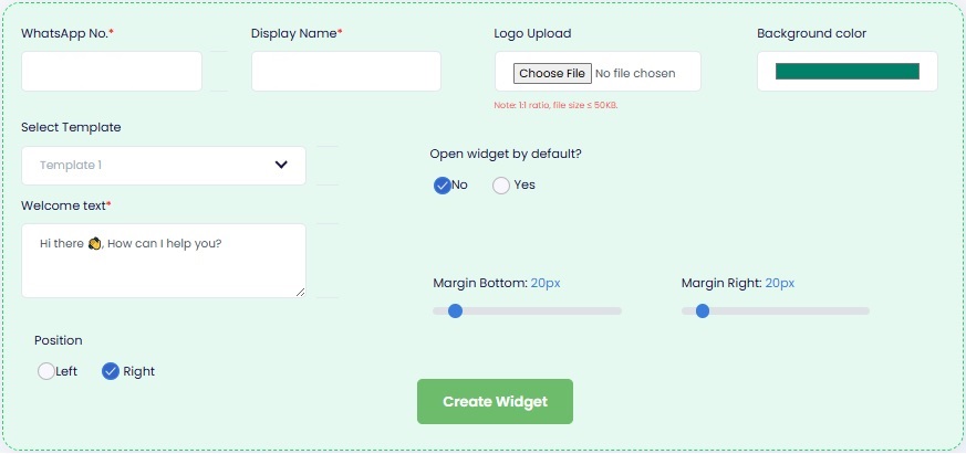 To make your WhatsApp Chat Widget match your brand, fill in the following fields: