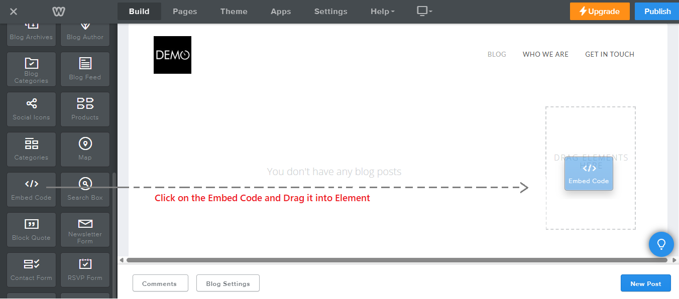 From the Elements Panel, drag the Embed Code block to the footer area of the page.