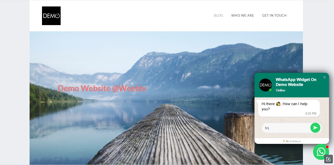 Below is an example of a Weebly website with the Authkey WhatsApp Chat Widget successfully integrated and visible in the bottom corner of the page.