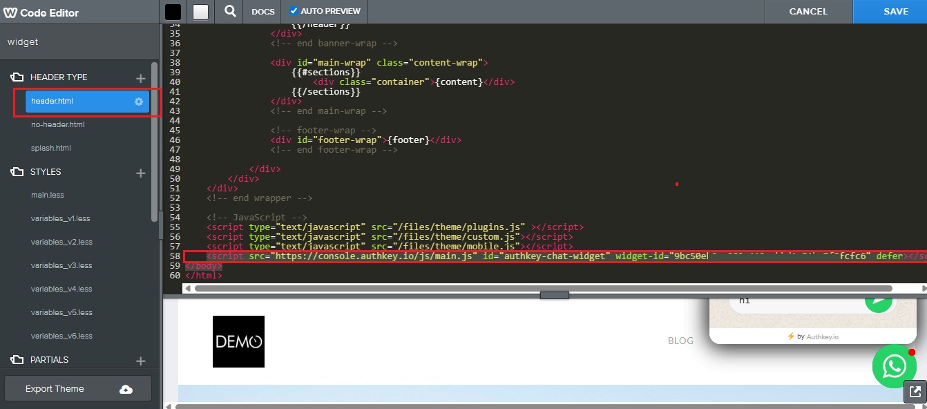 Open the header.html file and paste the WhatsApp Widget Code just before the closing </body> tag.